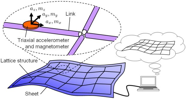![]() Fig.1 Illustration of 3DCS There is a lattice structure in the 3DCS, and a 6-axis sensor is attached on each link. The whole shape is estimated using the gravity and the Earth's magnetic field measured by sensors. |