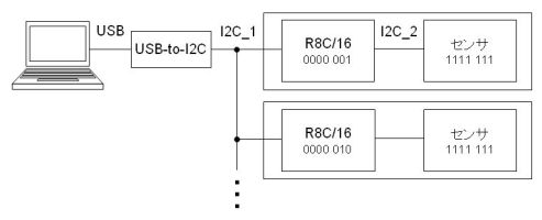 データを I2C 出力するセンサは通常、製品固有の同一アドレスを持ちます。 I2C を 2ch 持つマイコンがあれば、任意のアドレスを割り振ることができて便利です(図1)。 R8C/16 マイコン(Renesas Technology 株式会社)の I2C モジュールは 1ch ですが、 I2C のマスタ機能ならばソフトウェア的にもう 1ch 実装することができます1)。 ソフト的にやる場合、問題となるのはセンサ推奨の通信速度をクリアできるかどうかです。 例えば手元のセンサでは、50 kHz 〜 700 kHz が推奨されています。 ここでは、R8C/16 がどこまで高速にポートを駆動できるかを調べます。 部品数を減らすため、高速オンチップオシレータ (8MHz) のみでチャレンジします。 ![]() 図1 センサの複数接続。センサアドレス= 1111 111 の場合。 I2C_1 側でアドレスが重複しないようにしている。 |